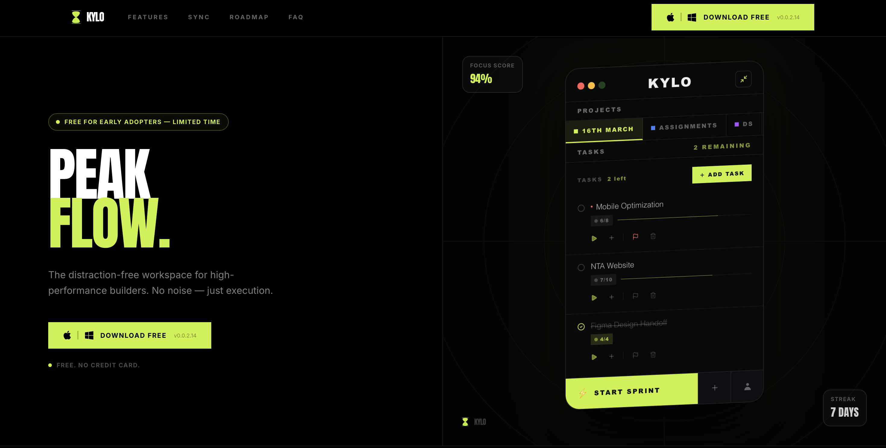 Bold, dark landing page for a productivity app targeting high-performance builders.